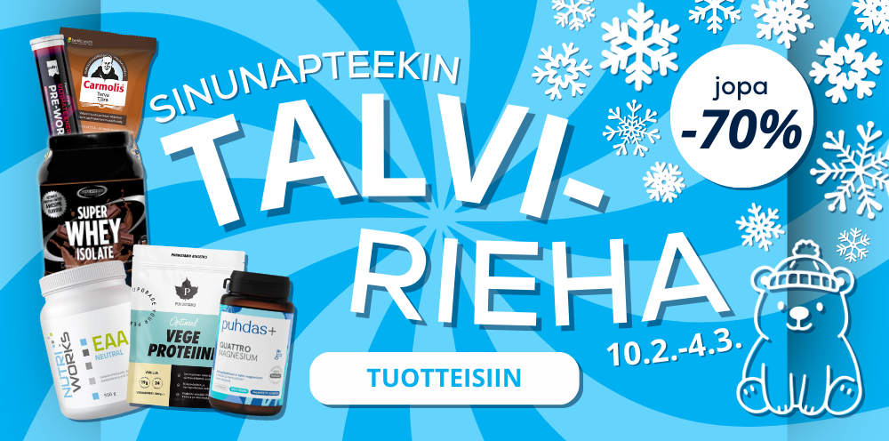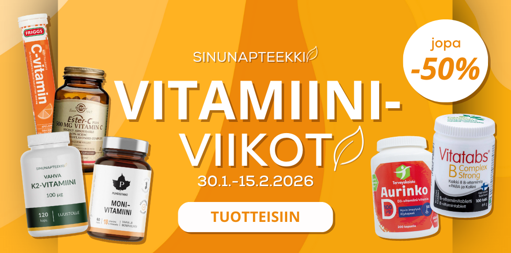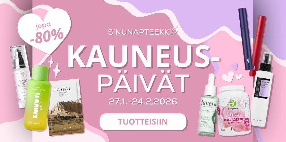Sinunapteekki on vuonna 2007 perustettu suomalainen luontaistuotteiden verkkokauppa. Tarjoamme laadukkaat tuotteet edullisin hinnoin ja nopealla, luotettavalla toimituksella. Laajasta valikoimastamme löytyvät hyvinvointiasi tukevat luontaistuotteet kuten kurkumavalmisteet, berberiinivalmisteet, maitohappobakteerit, ashwagandha-valmisteet sekä kollageeni -ja glukosamiinituotteet. Valikoimamme sisältää myös hivenaineet, vitamiinit ja rasvahapot jokapäiväiseen käyttöön: olipa tarpeesi sitten sinkki, magnesium, d-vitamiini, biotiinit, monivitamiinit tai omega-3, saat kaiken tarvittavan kätevästi meiltä. Huolella koostettuun valikoimaamme kuuluvat myös ihoasi hoitavat kosmetiikkatuotteet, kuten kasvovoiteet ja kasvoseerumit.