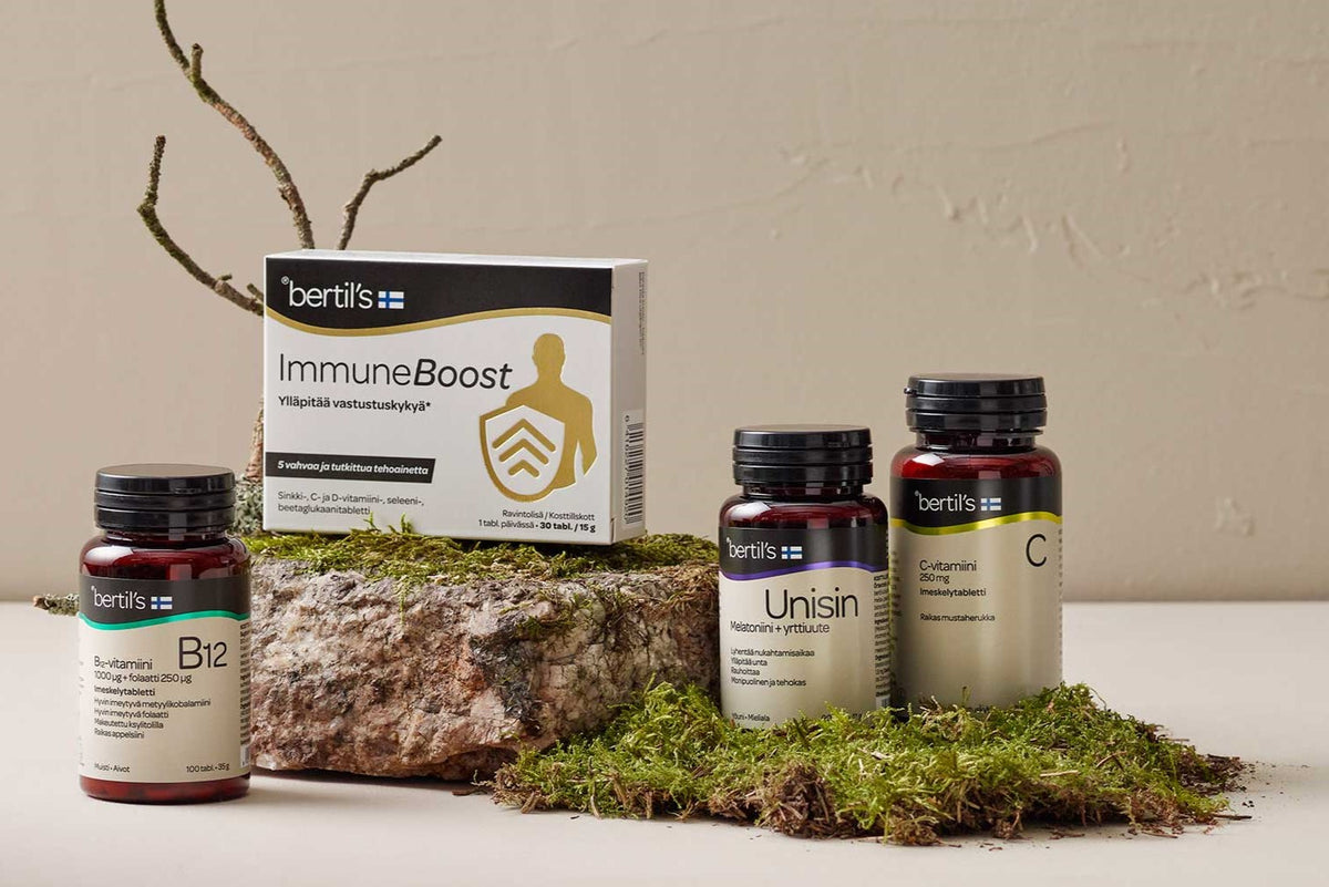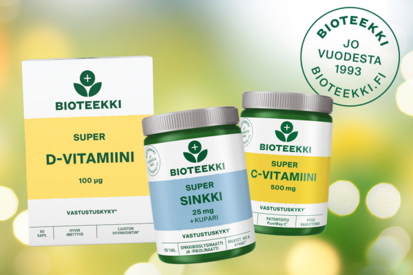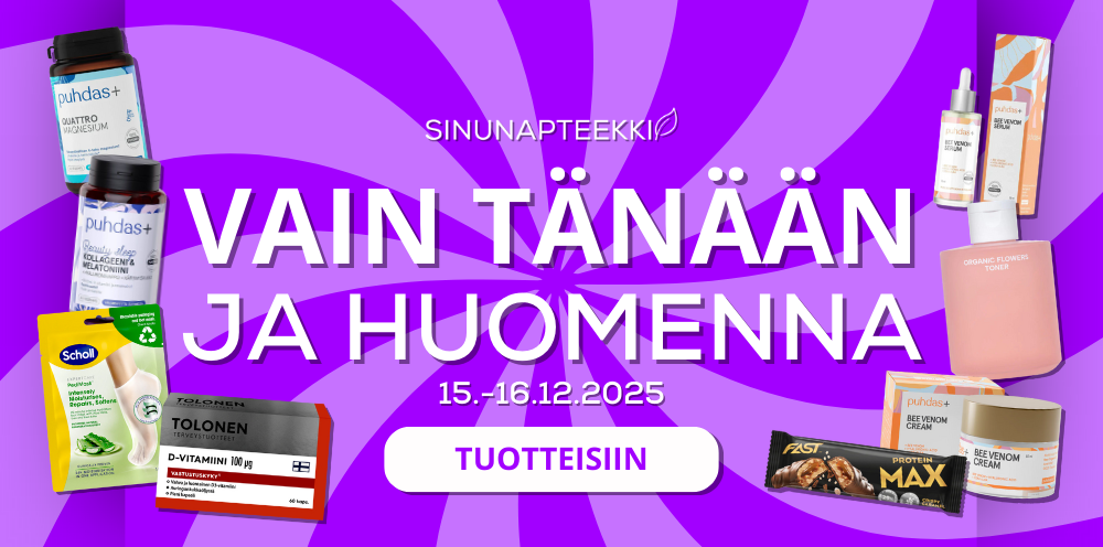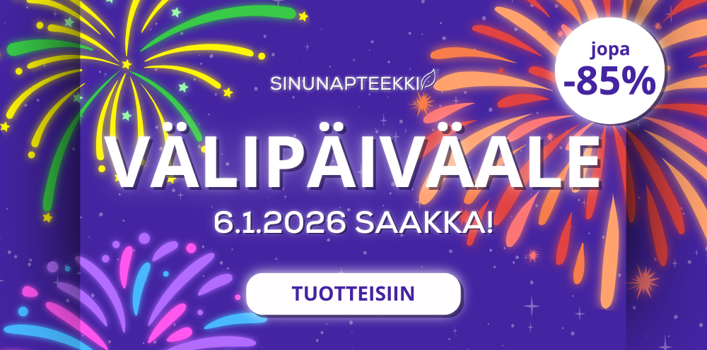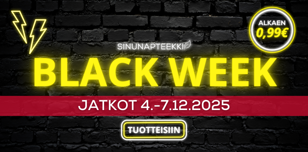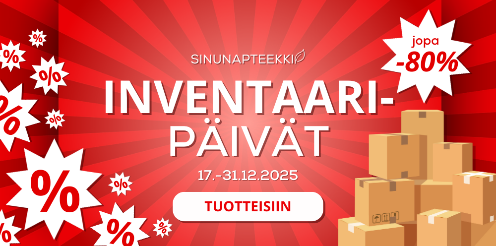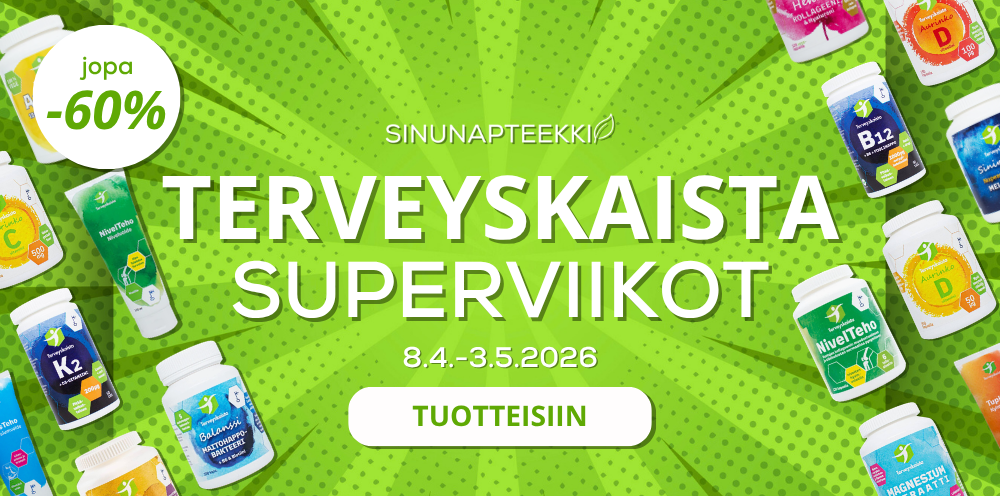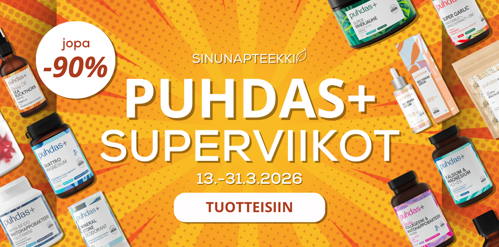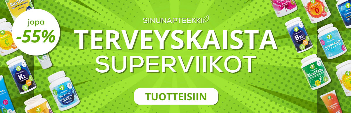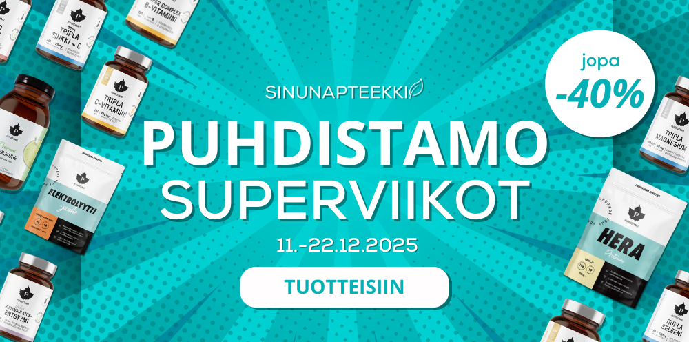 Sinunapteekki on vuonna 2007 perustettu suomalainen luontaistuotteiden verkkokauppa. Tarjoamme laadukkaat tuotteet edullisin hinnoin ja nopealla, luotettavalla toimituksella. Laajasta valikoimastamme löytyvät hyvinvointiasi tukevat luontaistuotteet kuten kurkumavalmisteet, berberiinivalmisteet, maitohappobakteerit, ashwagandha-valmisteet sekä kollageeni -ja glukosamiinituotteet. Valikoimamme sisältää myös hivenaineet, vitamiinit ja rasvahapot jokapäiväiseen käyttöön: olipa tarpeesi sitten sinkki, magnesium, d-vitamiini, biotiinit, monivitamiinit tai omega-3, saat kaiken tarvittavan kätevästi meiltä. Huolella koostettuun valikoimaamme kuuluvat myös ihoasi hoitavat kosmetiikkatuotteet, kuten kasvovoiteet ja kasvoseerumit.