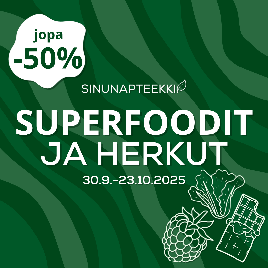 Sinunapteekki on vuonna 2007 perustettu suomalainen luontaistuotteiden verkkokauppa. Tarjoamme laadukkaat tuotteet edullisin hinnoin ja nopealla, luotettavalla toimituksella. Laajasta valikoimastamme löytyvät hyvinvointiasi tukevat luontaistuotteet kuten kurkumavalmisteet, berberiinivalmisteet, maitohappobakteerit, ashwagandha-valmisteet sekä kollageeni -ja glukosamiinituotteet. Valikoimamme sisältää myös hivenaineet, vitamiinit ja rasvahapot jokapäiväiseen käyttöön: olipa tarpeesi sitten sinkki, magnesium, d-vitamiini, biotiinit, monivitamiinit tai omega-3, saat kaiken tarvittavan kätevästi meiltä. Huolella koostettuun valikoimaamme kuuluvat myös ihoasi hoitavat kosmetiikkatuotteet, kuten kasvovoiteet ja kasvoseerumit.
