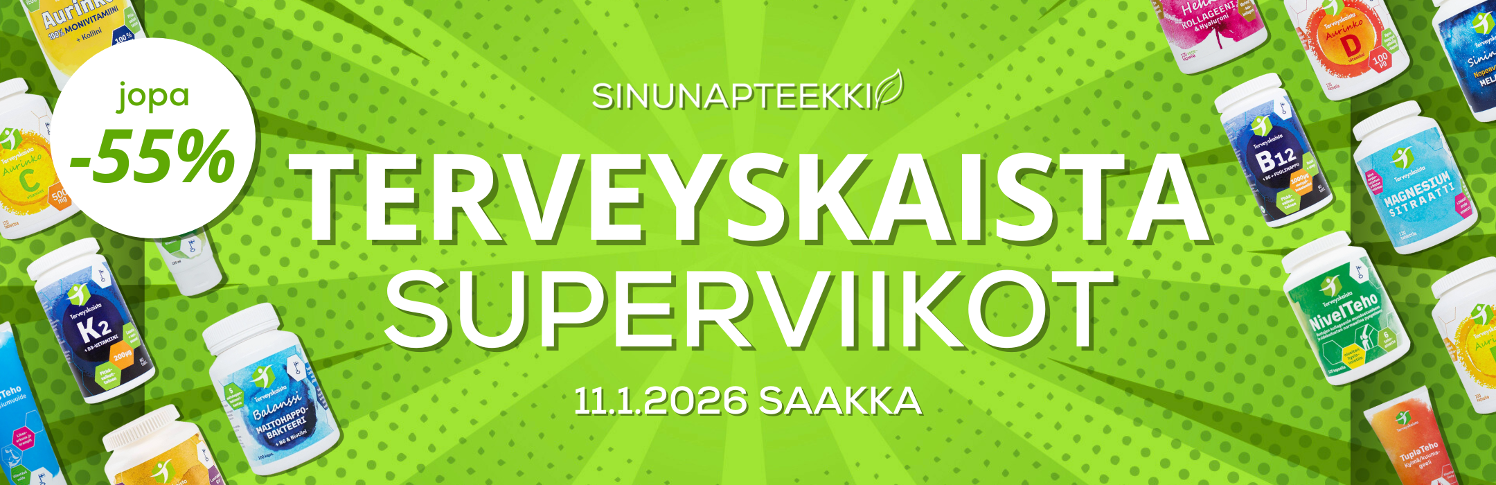 Osallistumisaika 23.12.2025-11.1.2026. Osallistut automaattisesti arvontaan ostamalla vähintään yhden Terveyskaistan tuotteen edellä mainittuna aikana. Arvontaan osallistuneiden kesken arvotaan yhdelle henkilölle Terveyskaistan vitamiinit vuodeksi (arvo 400 €). Voittaja saa itse valita haluamansa tuotteet Terveyskaistan valikoimasta. Valittujen tuotteiden arvo määräytyy verkkokauppamme sen hetkisten ovh-hintojen perusteella.